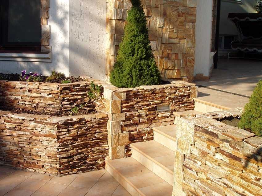 Площадка под навесом оформлена при помощи стилизованного под камень глазурованного керамогранита