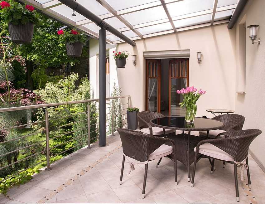 Пол на террасе частного дома облицован керамогранитом под камень