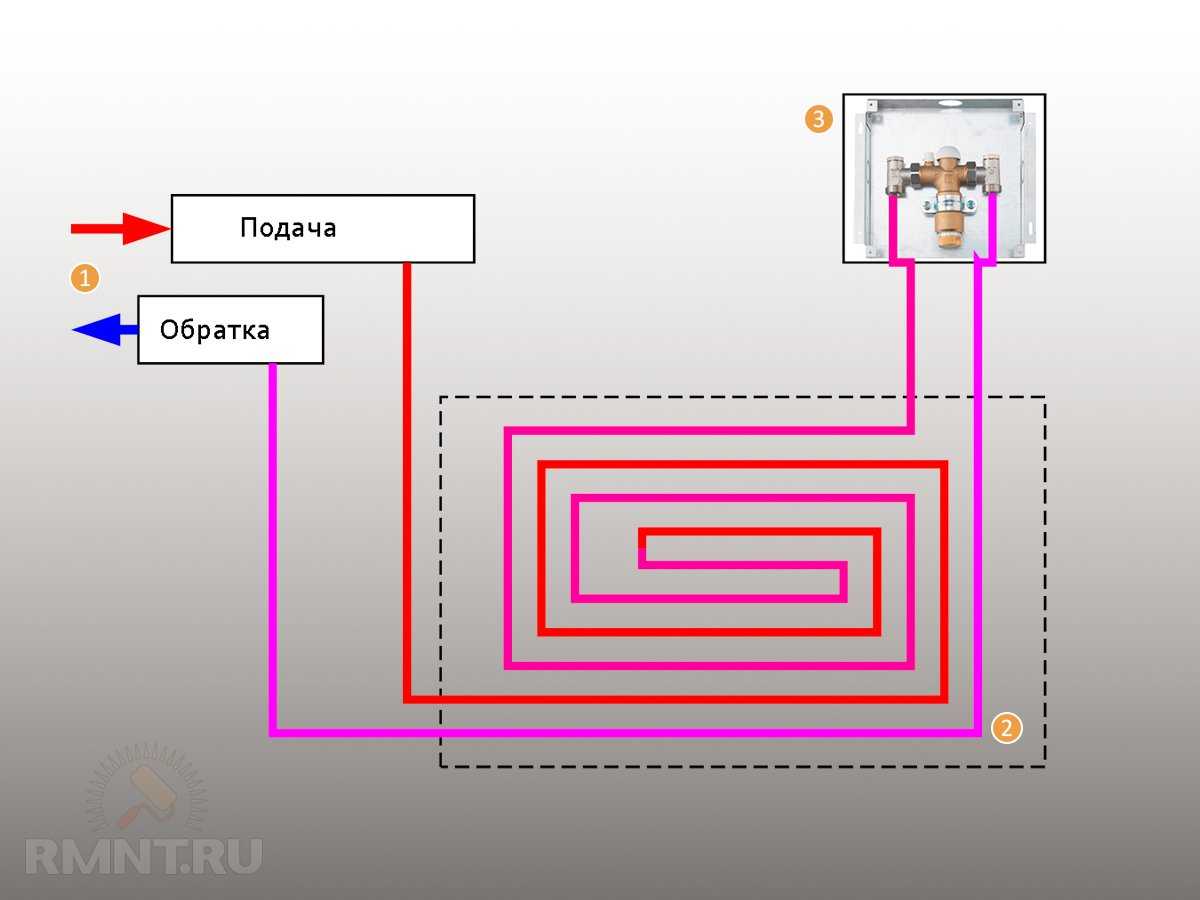 Нужно помнить, что характер работы тёплого пола может также меняться в зависимости от схемы укладки змеевика. Оптимальной считается схема «улитка», при которой трубки прокладываются парно, а значит, вся площадь обогревается почти равномерно. Если же тёплый пол устроен «змейкой» или «лабиринтом», то практически гарантировано образование более холодных и тёплых зон. Устранить этот недостаток можно, в том числе и за счёт правильной настройки.