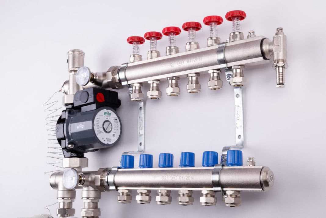 Через циркулятор смесительного устройства давление потока нагретой воды устанавливается и поддерживается во всех контурах под полом. Коллектор может поддерживать до 120 метров труб теплого пола на контур, поэтому перед подачей воды в эти трубы расход для отдельных контуров устанавливается с помощью расходомеров в соответствии с потребностями конкретного контура.При правильной настройке это гарантирует, что зоны нагрева будут равномерно обогревать пространство, даже если использовалась разная отделка пола.