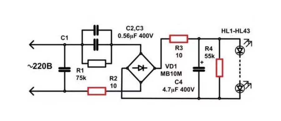 Это самый распространенный тип сборки, который используется в бытовых лампочках. Основными элементами для снижения напряжения выступают конденсаторы С2, С3 и резистор R1. Во время включения лампы резисторы R2 и R3 предохраняют прибор от короткого замыкания и ограничивают ток. Встроенный защитный диод VD1 нужен для преобразования напряжения.