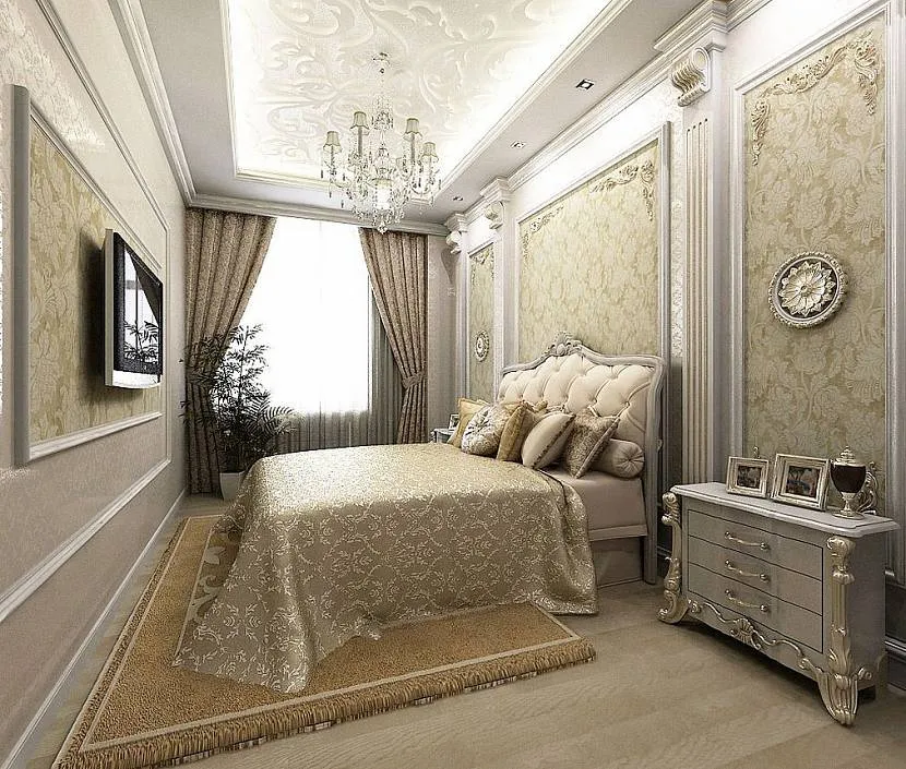 В отделке спальни в классическом стиле применяют античные детали. Гипсовые карнизы с растительным орнаментом перекликаются с багетами картин (зеркал). Вместо массивных колонн по бокам кровати лучше установить пилястры. Встроенные в стену сооружения не занимают много места, при этом воссоздают атмосферу роскоши. На потолке под люстрой – декоративная лепнина.