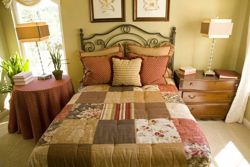 Кровать – центральный элемент декора: она должна быть массивной и высокой. Традиционно, ложе выполняется из древесины натурального цвета или окрашенной в тон остальной мебели. Кованое изголовье придаст комнате легкий оттенок прованса.