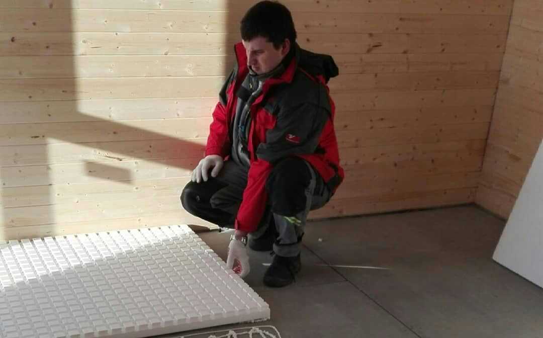 Как и в любом доме для того, чтобы положить трубы нам необходимо положить на перекрытие материал, который будет отражать тепло наверх. В нашем случае это готовые маты из пенопласта с уже имеющимися ламелями под трубы.