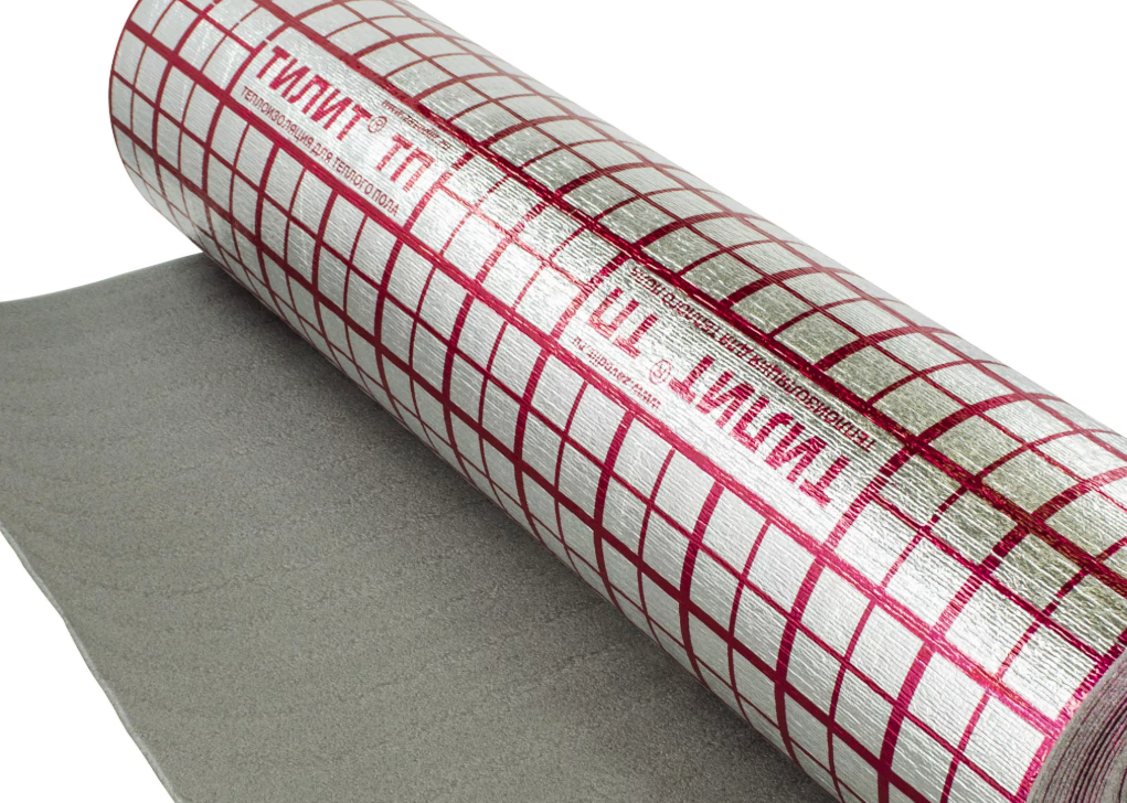 Материал, удерживающий тепло — обязательный компонент такой системы отопления. Он служит для предотвращения теплопотерь через перекрытия. В качестве основной теплоизоляции используют вспененный полистирол плотностью 25-35 кг/м³. Материал с меньшими показателями не сможет выдержать вес стяжки. Толщиной плиты полистирола должны быть не меньше 5 см. Если их укладывают на грунт или внизу неотапливаемое помещение, желательно увеличить этот параметр до 10 см. Чтобы снизить теплопотери, поверх основной изоляции укладывают отражающий экран. Это может быть пенофол или простая пищевая фольга. Однако металлизированное покрытие необходимо защитить от агрессивного воздействия бетонного раствора, закрыв полиэтиленовой плёнкой.