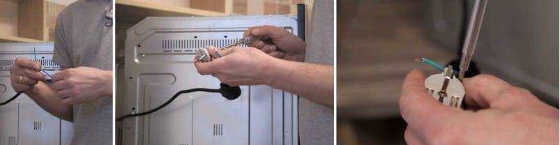 На других агрегатах установлен только клеммник с винтами. Для подключения такой духовки необходимо кабель затянуть винтами, а евровилку подключить с другой стороны. Перед тем как установить встроенный духовой шкаф своими руками и проводить электромонтажные работы, нужно обязательно отключить напряжение сети.